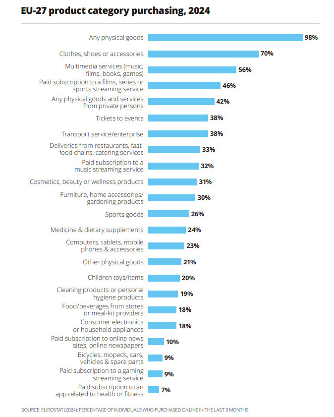欧州のオンラインショッピング利用者の70%が衣料品、靴、アクセサリーを購入しており、マルチメディア関連製品(56%)やストリーミングのサブスクリプション(46%)を大きく引き離していることが、オンライン小売の業界連合体であるEcommerce Europeが最近公表した2024年のデータで明らかになりました。