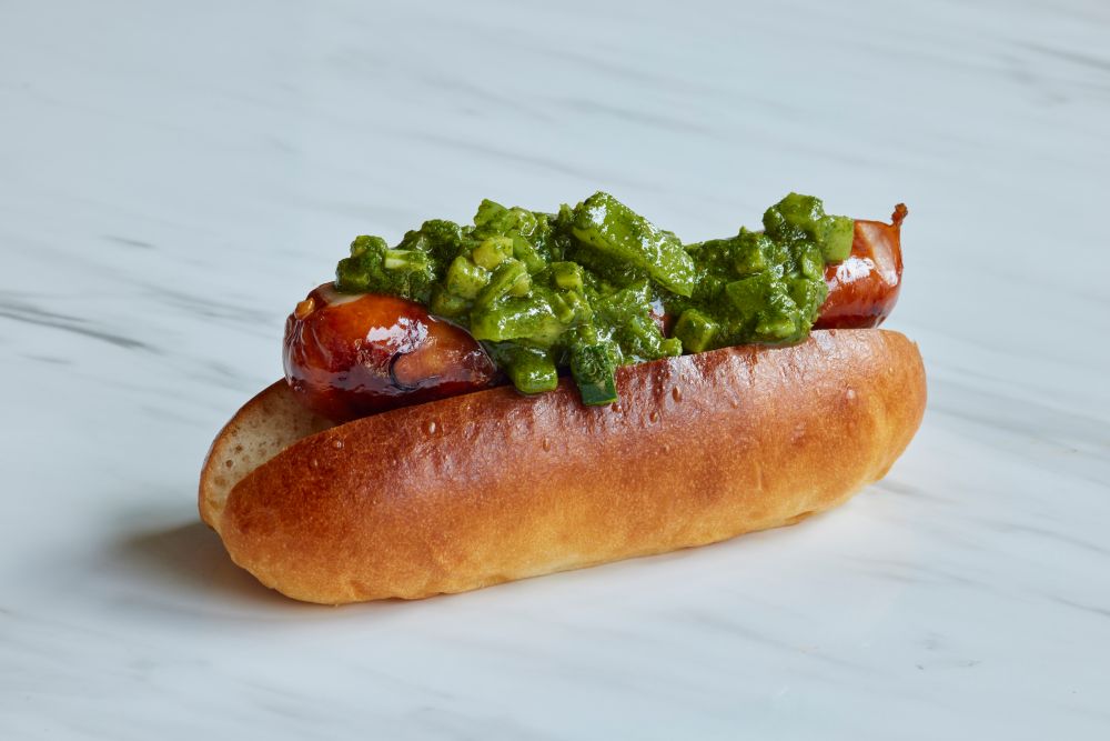 ハーブとビネガーの効いたチミチュリソースと粗挽きのソーセージの相性のいいホットドッグ