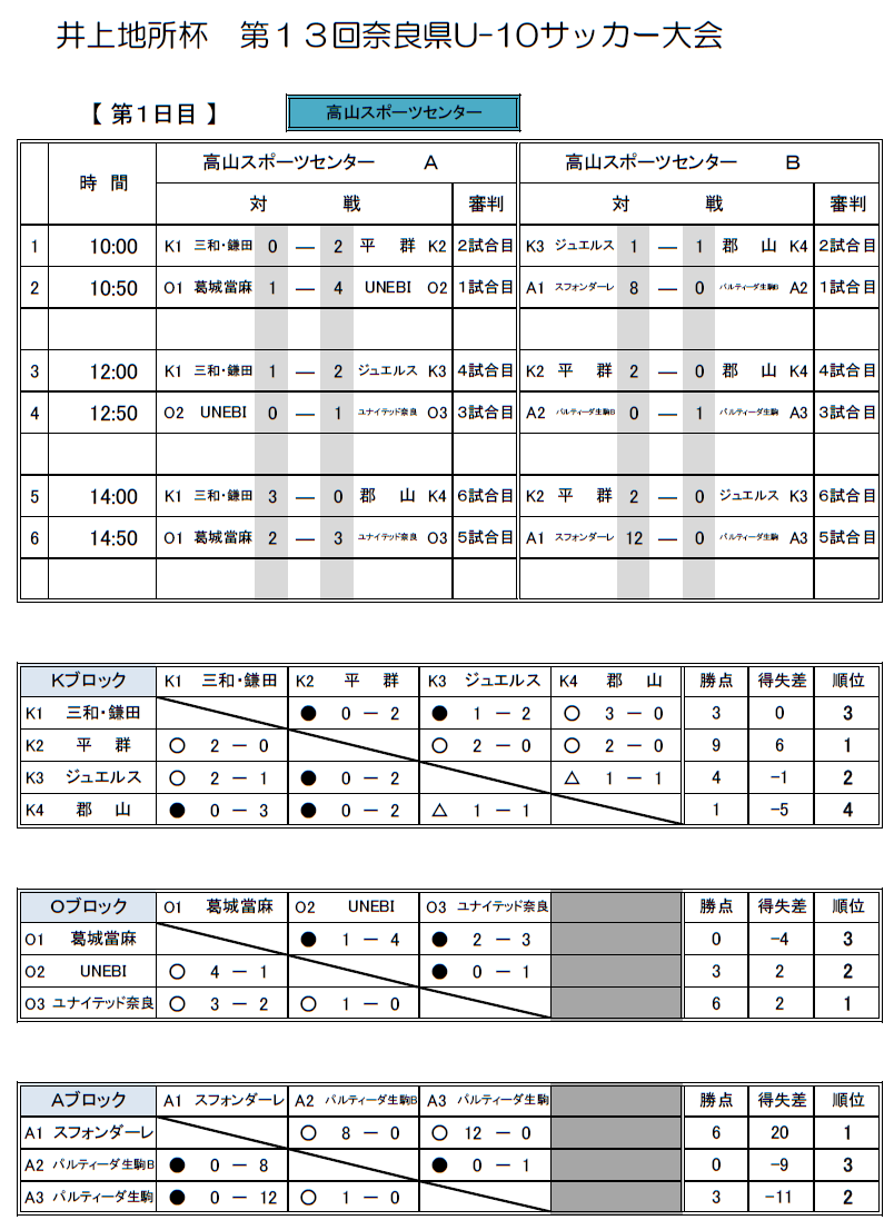 Kグループ:1位 平群、2位 ジュエルス、3位 三和・鎌田、4位 郡山