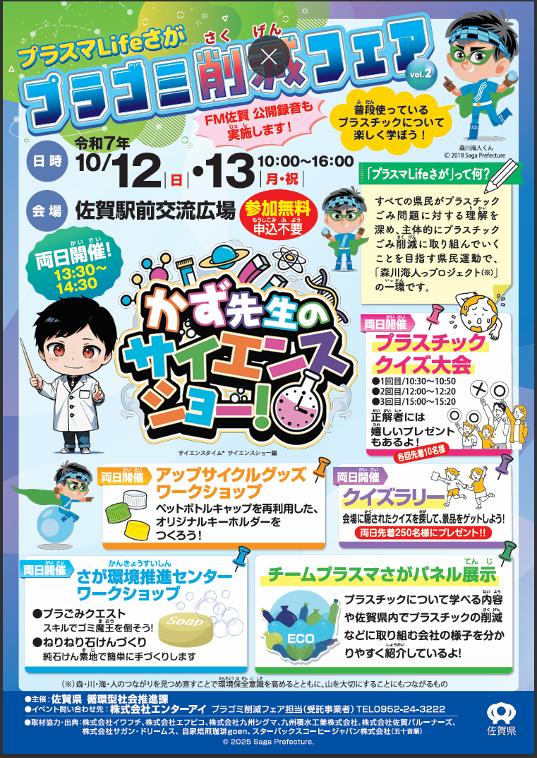 佐賀県主催のプラスチックごみ削減について楽しく学んでいただくためのイベント「プラゴミ削減フェアvol.2」が令和7年10月12日(日曜日)・13日(月・祝日)に佐賀駅前交流広場にて開催されました。