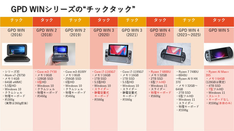 Intelの「チックタック」とは、1年おきに「製造プロセスの微細化(チック)」と「マイクロアーキテクチャの刷新(タック)」を交互に繰り返す開発手法。“チック”が既存設計の成熟と性能向上を担い、“タック”が抜本的な設計変更による機能や効率の革新を担う。そしてGPDの場合、アーキテクチャを刷新する“タック”のタイミングで、WINの後ろに続くモデルナンバーが1つ進むという明確な法則性が見て取れる。