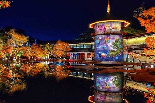 秋の深まりとともに、松島離宮の庭園と山々を彩る、計100本を超えるイロハモミジやヤマモミジが紅く鮮やかに色づき、一年で最も美しい光景が広がります。日が沈むとその光景は、日本で唯一現存する十角三重塔や、庭園の水面に映り込み、より幻想的な世界を創り出します。その絶景に加え、プロジェクションマッピングがさらに彩りを添えます。