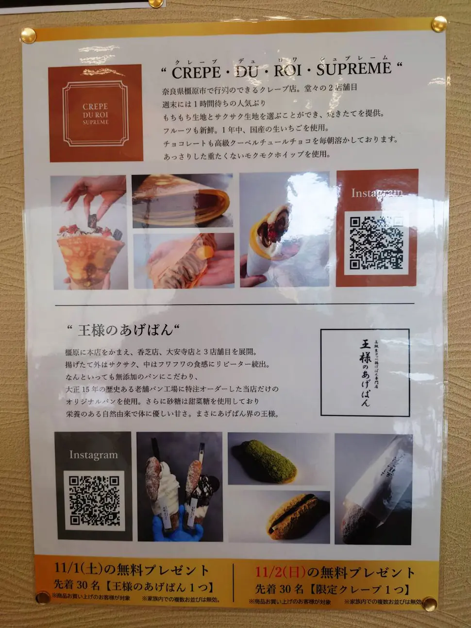 11月1日(土) 先着30名「王様のあげぱん」1つプレゼント、11月2日(日) 先着30名「限定クレープ」1つプレゼントとのこと。