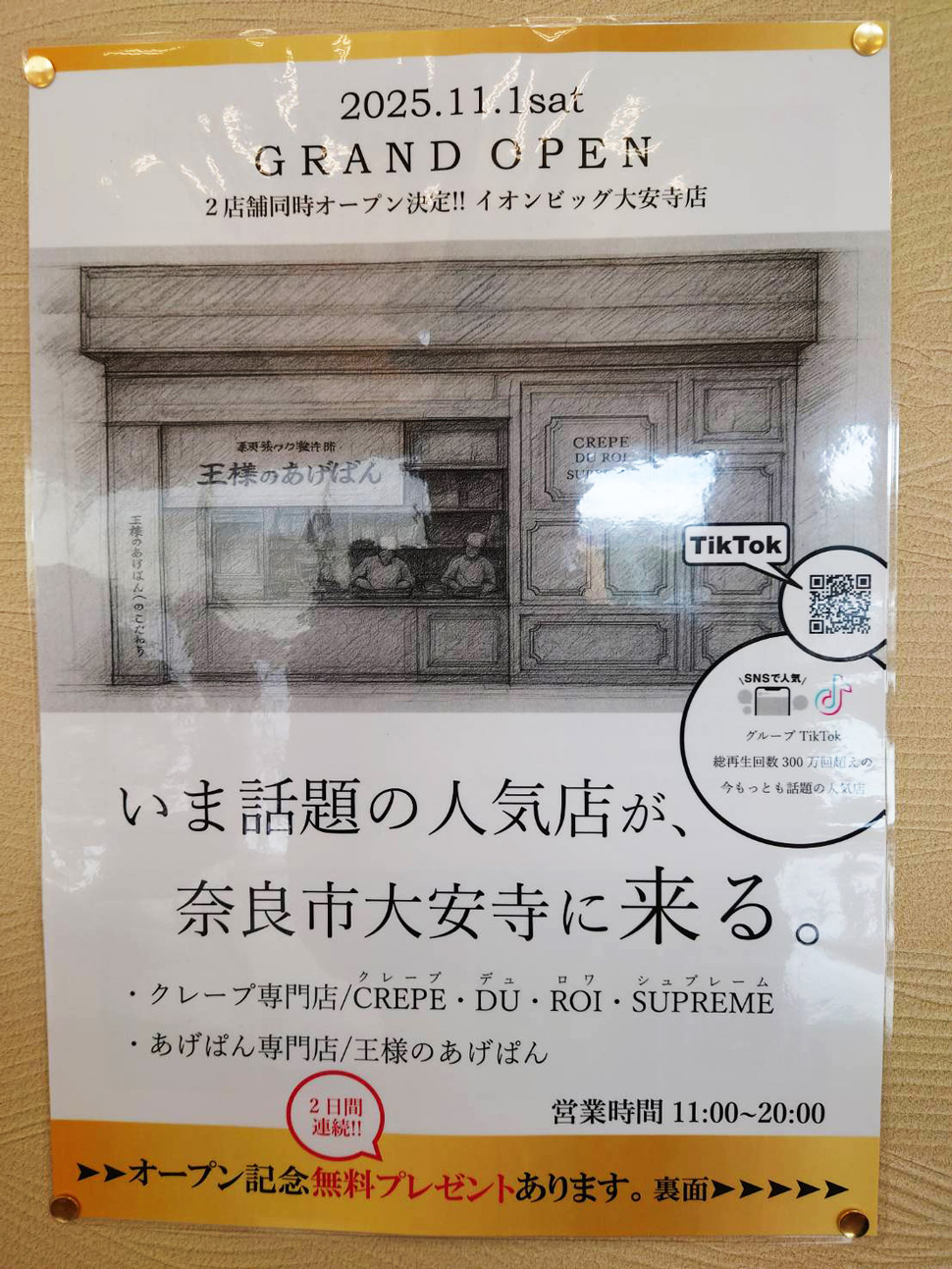 2025年11月1日(土)にオープンするのは、「クレープ・デュ・ロワ・シュプレーム」と「王様のあげぱん」。