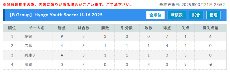 B Group 3/21全試合終了 ご入力ありがとうございます