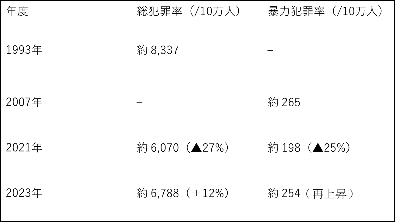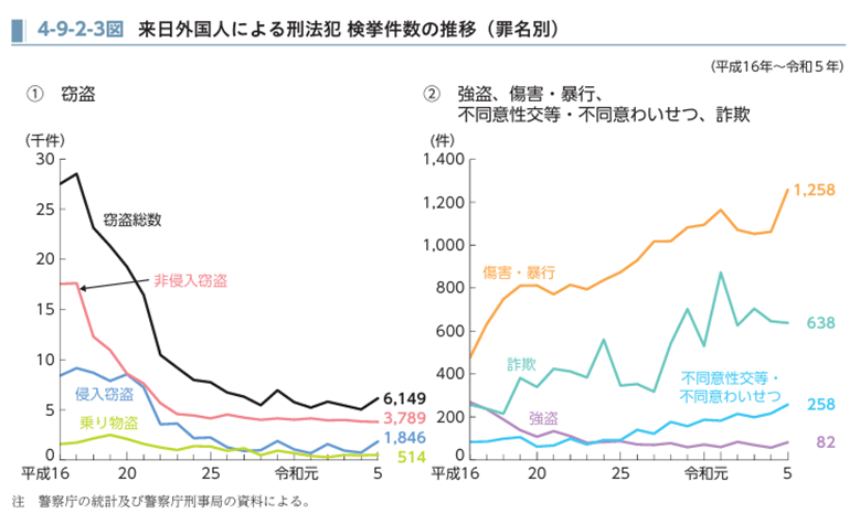日本でも外国人を含む全体の犯罪数は減少傾向にありますが、それは多数を占める窃盗(特に万引き)の減少の影響によるものです。実際に外国人による傷害・暴行事件の増加が示されています。
