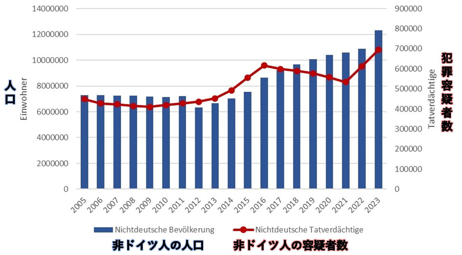 暴力犯罪の容疑者における外国人の割合がドイツ人よりも4倍高かったことを記録しており、すべての犯罪全体では、この割合はほぼ3倍高い。全犯罪全体では、2024年の割合は41.8%で、2023年より0.7%ポイント上昇し、2010年のほぼ2倍となった。