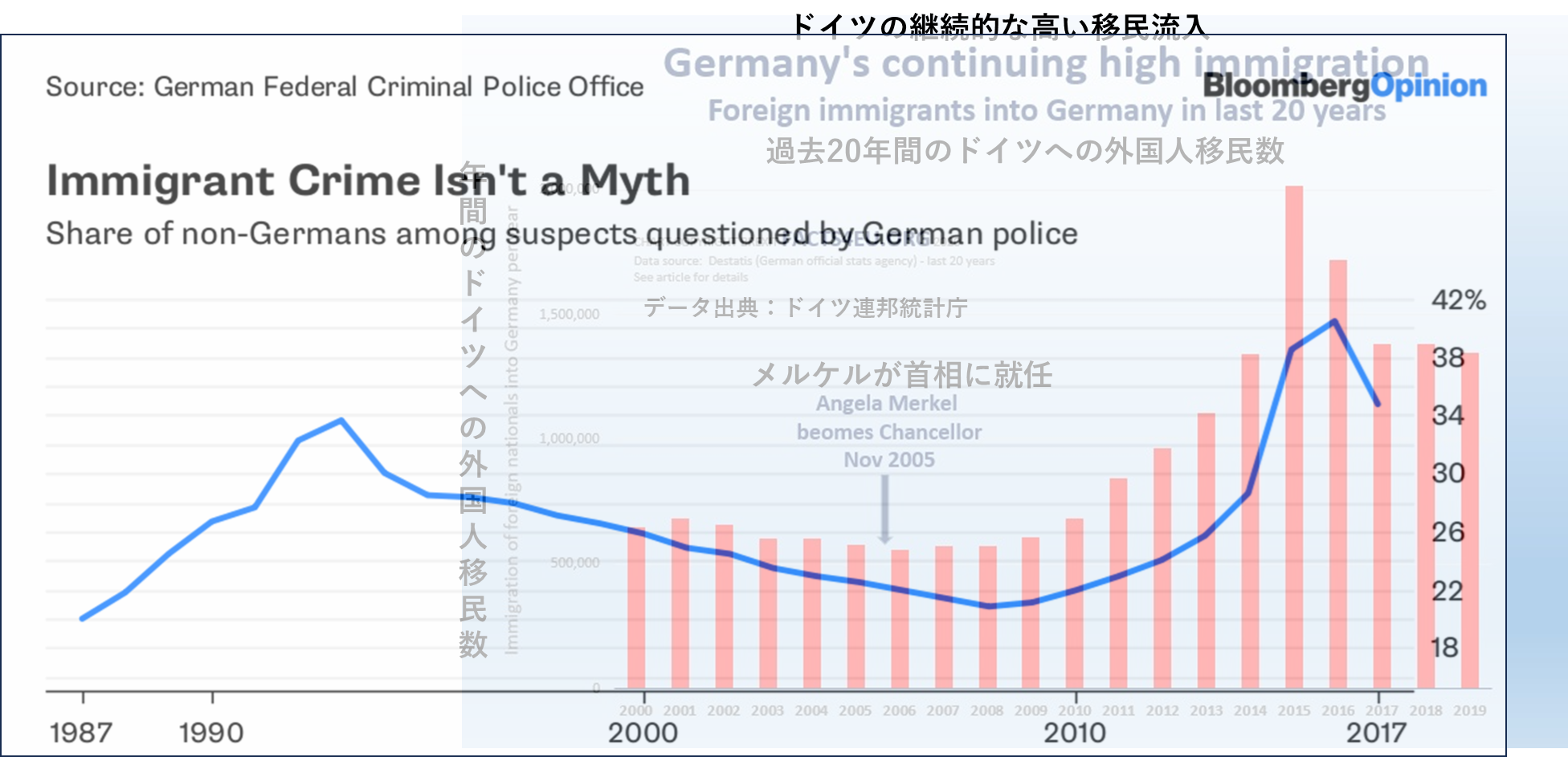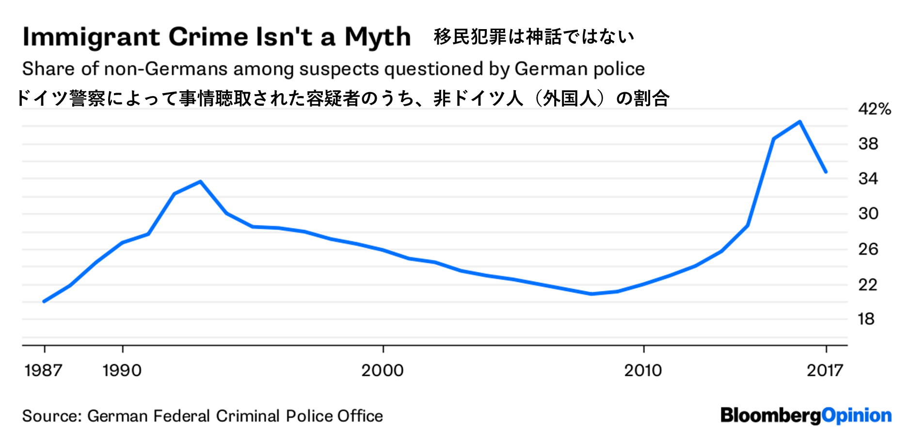 最近ドイツの移民事情を調べる中で、これまでは「労働力不足を補う」という観点で見ていましたが、同時に「社会保障を維持する」という視点も極めて重要であると気づきました。同時に調べてみますと、ドイツでは治安の悪化が問題視されています。