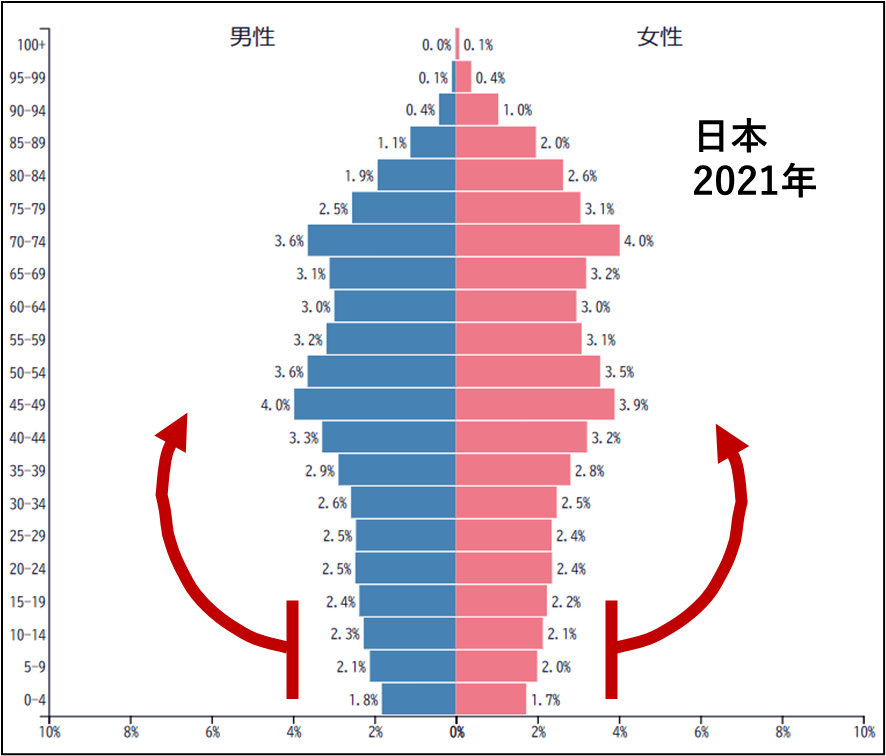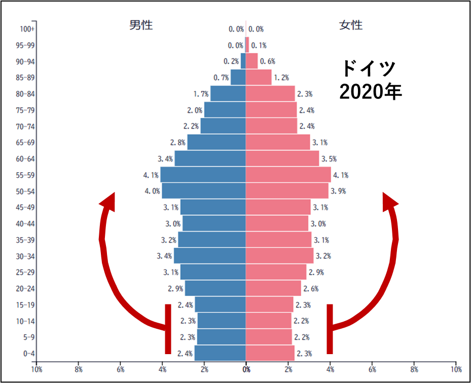 2020年のデータによると、ドイツの最大人口層(50~60歳代)は約4%ですが、それを支える世代は2.4%前後となっています。ドイツも高齢化が進んでいますが、支える側の人口が日本よりも確保されている状況です。