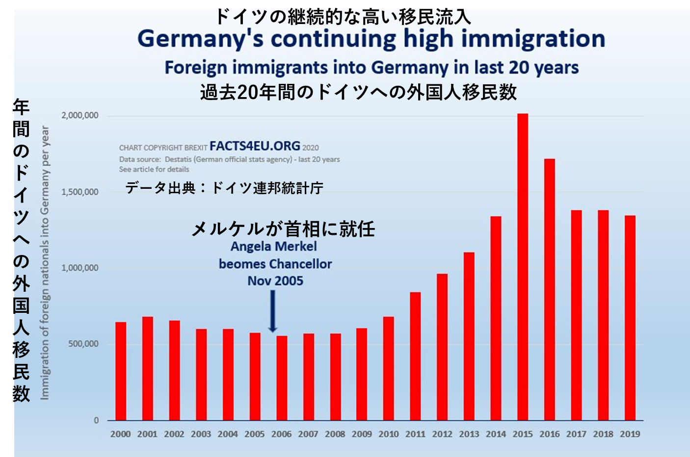 1995年頃の急増は、1989年にベルリンの壁崩壊後に東欧からの移民や難民を受け入れた影響です。その後一時的に安定したものの、2015年以降、再び増加傾向を示しました。