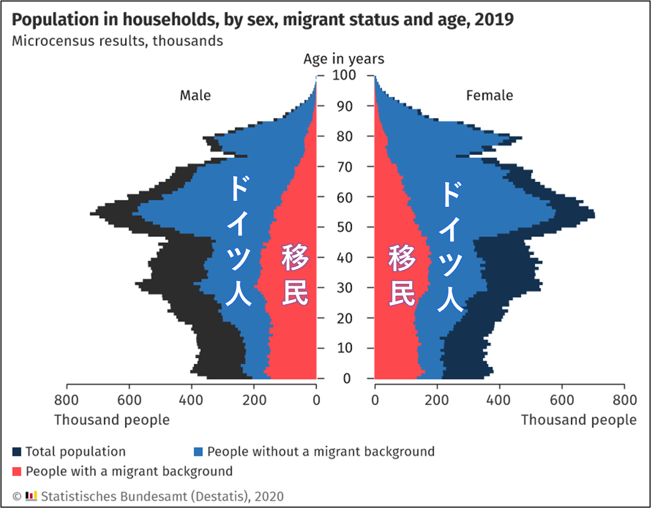 しかし、ここで実態を見てほしいのです。2019年のドイツの人口ピラミッドには、外国にルーツを持つ人々とドイツ出身の人々を分けた図です。
