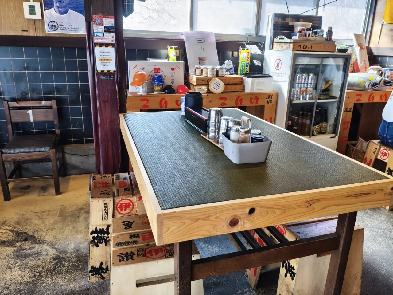 イリコを運ぶ木箱を模した椅子や畳面を張った机が、レトロな内観とマッチしてアート感を醸し出す店内です。