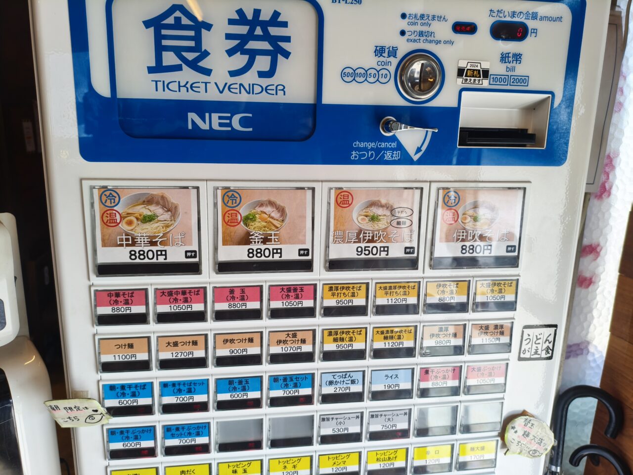 注文は入口横の券売機で発券してお店の方に渡します。冷熱や麺の太さを選べるものはその際口頭で店員さんに伝えます。