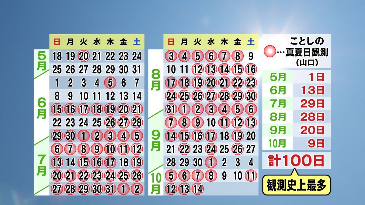 山口市内の、今年最初の真夏日は5月20日…そして6月半ば頃から9月も半ば頃までは、丸3か月、ほぼ毎日のように気温30度以上の真夏日となる日々で、さらに今月もまだ残暑が長引き、とうとう真夏日100日目となった状況です。山口市内における年間の真夏日100日は、観測史上最多記録。人生で初めて経験する長い暑さの日々を過ごしてきた、ということになります。