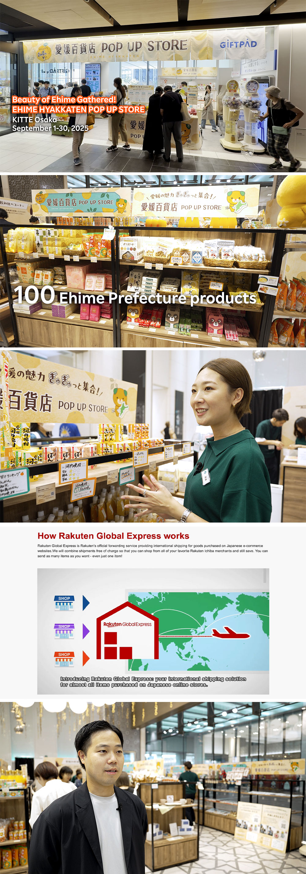 2025年9月、楽天グループは「愛媛百貨店POP UP STORE」を東京・大阪の2都市で期間限定オープンしました。 大阪・関西万博や世界陸上の開催時期に合わせてインバウンド需要を取り込むことで、愛媛県産品が国内外の多くの人の目に触れる機会を創出しました。 各商品にQRコードを設置してオンライン購入を可能にしたほか、海外配送サービスの楽天グローバルエクスプレスとの連動により、お客様が手ぶらで観光を楽しめるショッピング体験を提供しました。