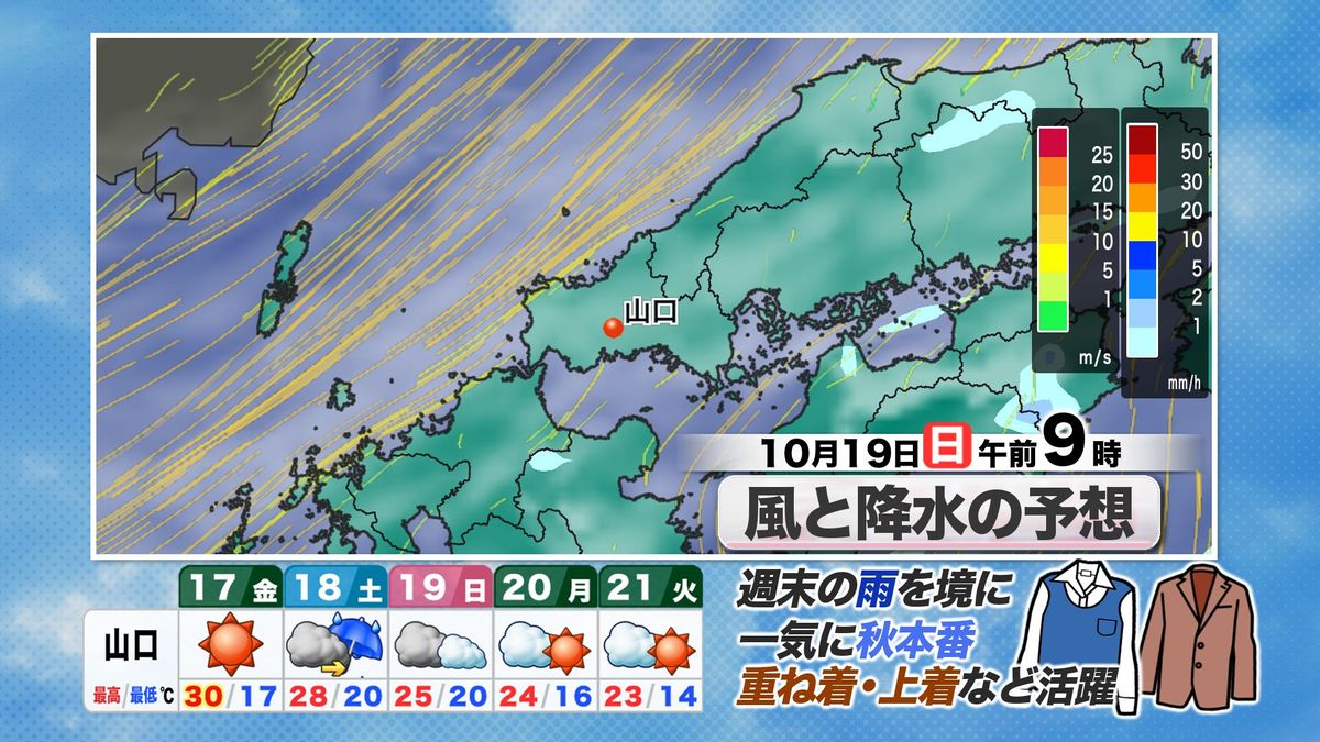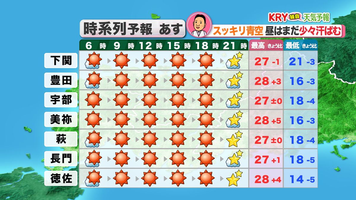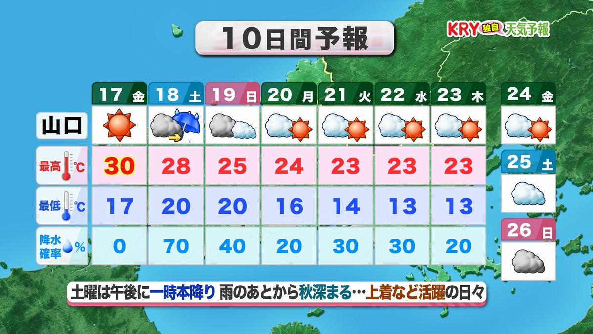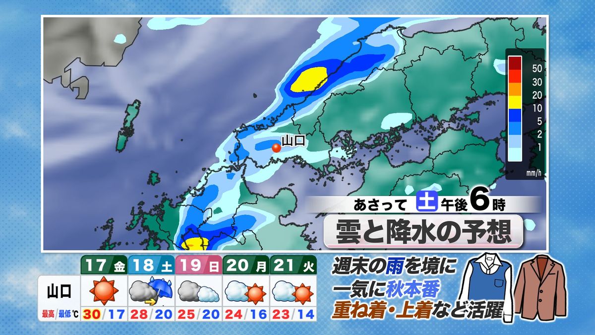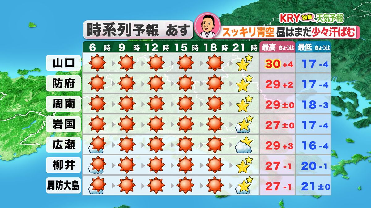 あす17日(金)の県内は、スッキリ青空が広がる一日となりそうです。朝は広く気温は20度を下回って少し空気はヒンヤリとしてきますが、日中はタップリの日ざしで、山口市内では30度に届く真夏日の予想…昼間は、まだ夏の名残を感じる暑さとなるでしょう。