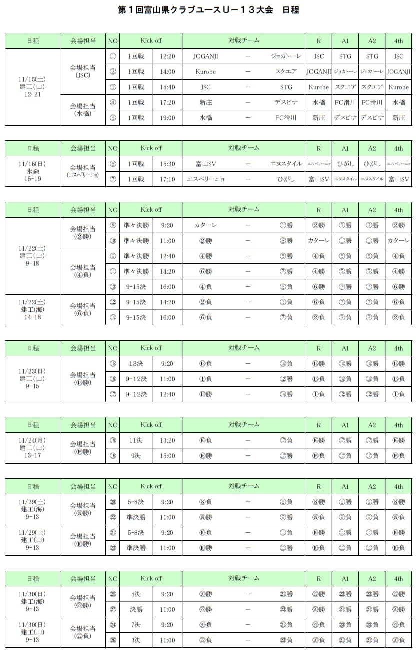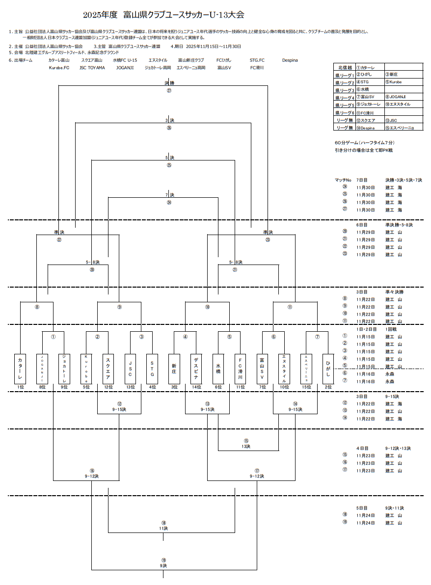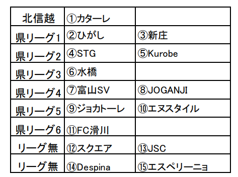 カターレ富山 スクエア富山 水橋FC U-15 エヌスタイル 富山新庄クラブ FCひがし STG.FC Despina Kurobe.FC JSC TOYAMA JOGANJI ジョカトーレ高岡 エスペリーニョ高岡 富山SV FC滑川