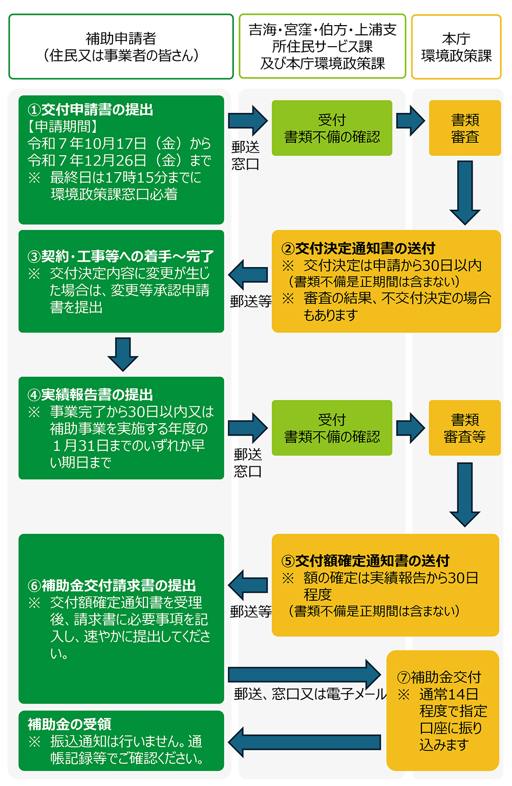 補助申請期間中に、本庁環境政策課又は吉海・宮窪・伯方・上浦支所住民サービス課まで交付申請書を提出してください。その後の手続きの流れは以下の図をご参照ください。