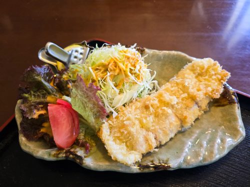 肉厚なまぐろの身に、チーズを挟んだまぐろカツは、粗めのパン粉で、外側サクサク中はしっとり。チーズがとろりと溢れます。