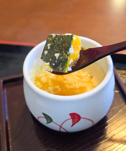さらに、茶碗蒸しも付いています。なんと、中にはかぼちゃが入っていました。時期によってはさつまいもが入ることもあるようです。