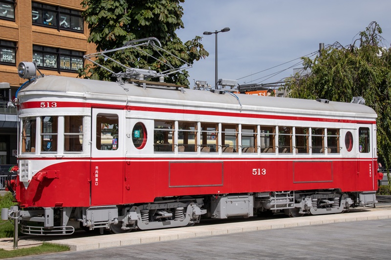岐阜駅北口駅前に静態保存中の大正15年製造「モ513」は、丸窓が特徴の路面電車