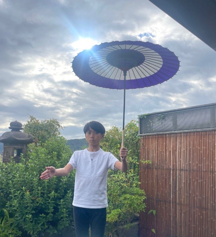 翌日、團十郎さんはブログに一言「やろか」とだけ投稿。そこには、勸玄さんが屋上の庭園らしき場所で和傘をかぶって顔を隠し身を屈めて、稽古に励んでいる様子の写真が投稿されています。