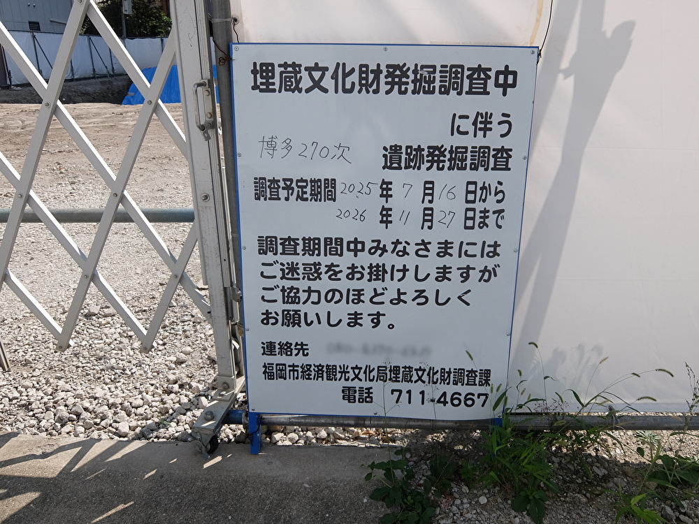 現場には、「埋蔵文化財発掘調査中に伴う博多270次遺跡発掘調査」と書かれた看板がありました。