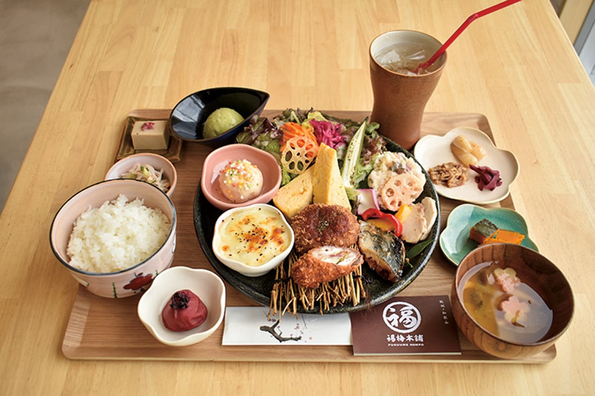 創業40年の梅干し専門店がオープンした〈FUKUUME CAFE〉のスペシャルメニュー。塩をつかわず、梅干し、梅酢、梅ジャムなどと最低限の調味料だけで味つけ。