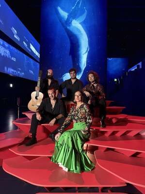 巨大な水中シーンの映像投影やホログラム映像を通じて、スペインのブルーエコノミー(海洋経済)、再生可能エネルギーの進歩、そして日本との歴史的な関係を紹介。