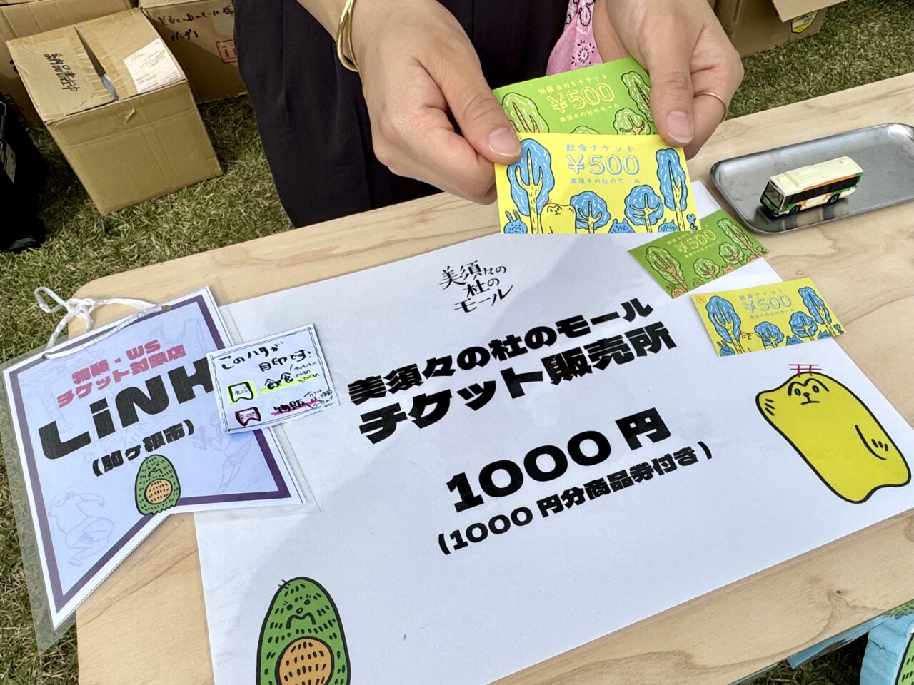 1000円でチケットを購入すると、物件・ワークショップに使える500円券とご飲食に使える500円券にプラスして、ノベルティが一つもらえます。