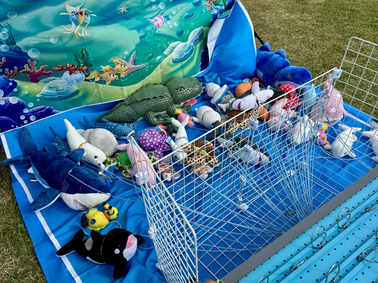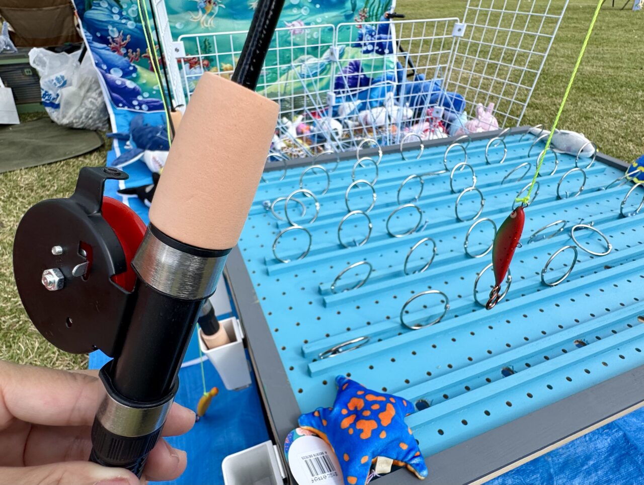 竿を使って銀色の輪っかを釣ると紐で繋がれた魚をGETできる魚釣りゲーム(魚のぬいぐるみです)も楽しそう!