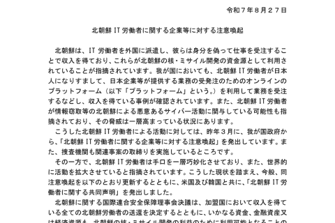 日本政府は8月27日、米国・韓国と共同で、身分および所在地を偽って業務を受注し、核や弾道ミサイル開発の資金源としている北朝鮮IT労働者に対して懸念を表明する「北朝鮮IT労働者に関する共同声明」を公表した。
