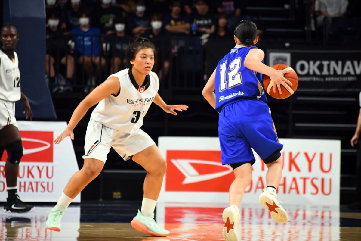 女子決勝は、出だしから石川ペース。184cmという圧倒的な高さと体の強さを持つセネガル出身の留学生、#12ボリー・アイダ・ラソウルがゴール下で存在感を発揮し、ポストプレーやオフェンスリバウンドからシュートを決めて前に出た。チームとしても高い位置からのプレッシャーディフェンスを継続し、前半で47ー23と大きくリードした。