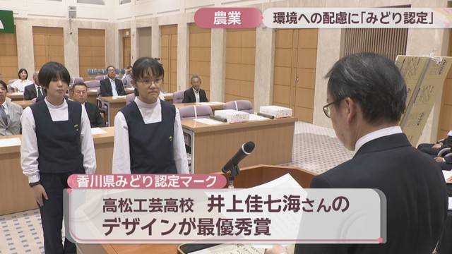 香川県は「みどり認定」のマークのデザインを募集し、高松工芸高校の井上佳七海さんのデザインが50点の中から最優秀賞に選ばれました。認定を受けた事業者の農産物のパッケージなどに使われます。