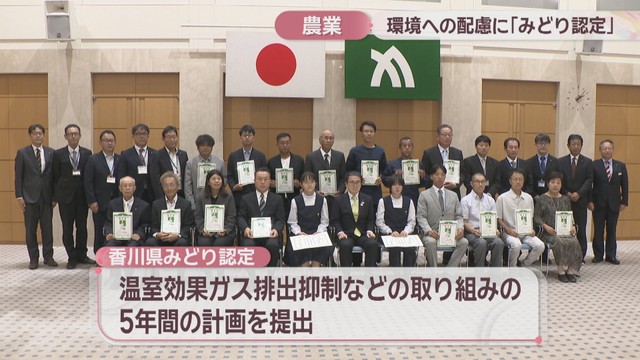 香川県で環境に配慮した農業に取り組む個人や団体に17日、知事が「みどり認定」の認定証を手渡しました。