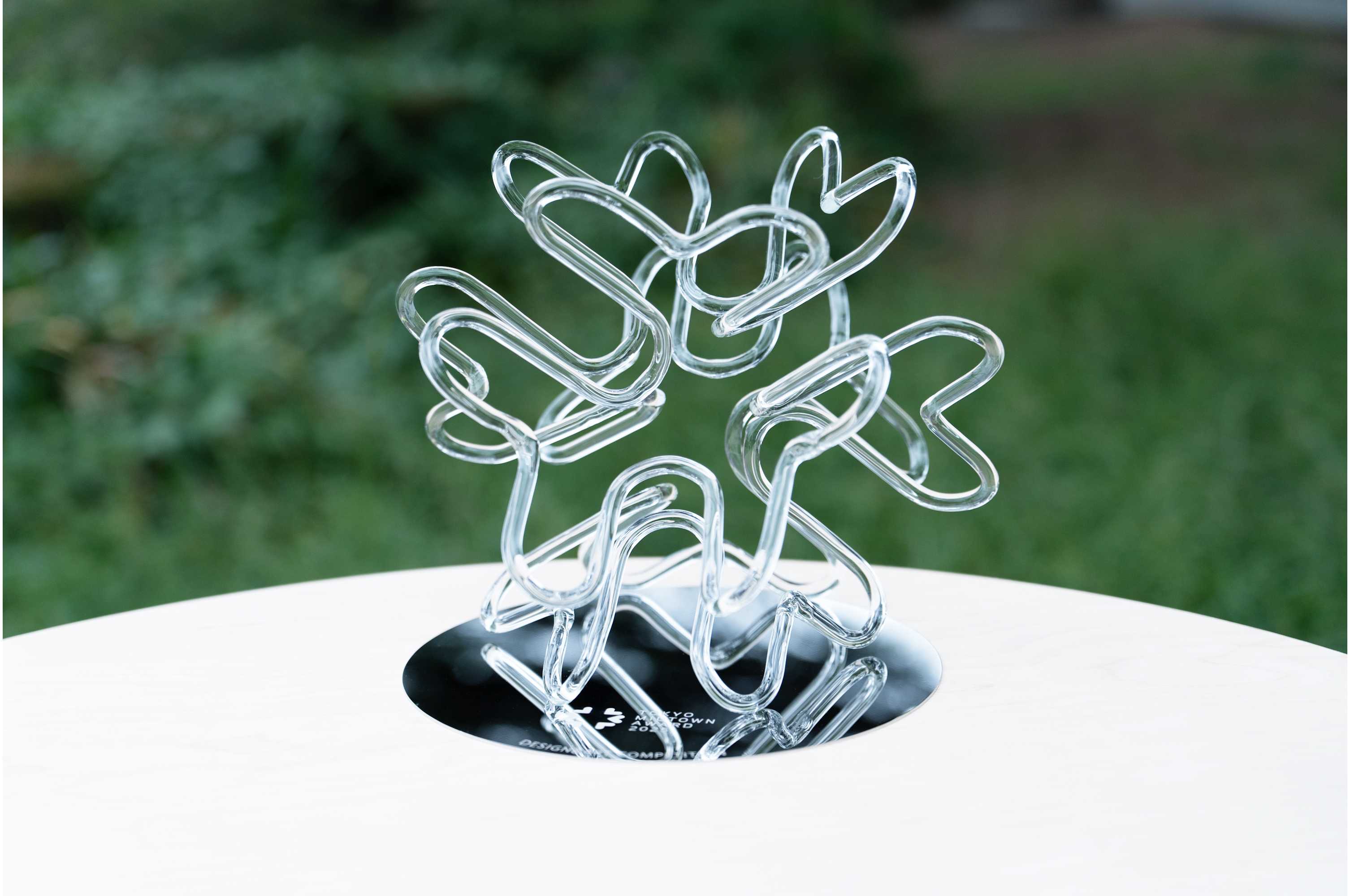 TOKYO MIDTOWN AWARDのロゴを立体にし、一筆書きのガラスのトロフィーにしました。見慣れているロゴも、立体にし角度を変えてみると全く違った形と繋がりが見えてきます。世の中にある事象をいつもと違う角度から見て、新しい発見をすることからアートもデザインもはじまるのではないでしょうか。私たちを取り巻く世界を新鮮な気持ちで見回していく、そんな姿勢でものづくりに向かっていきたいという思いを込めました。