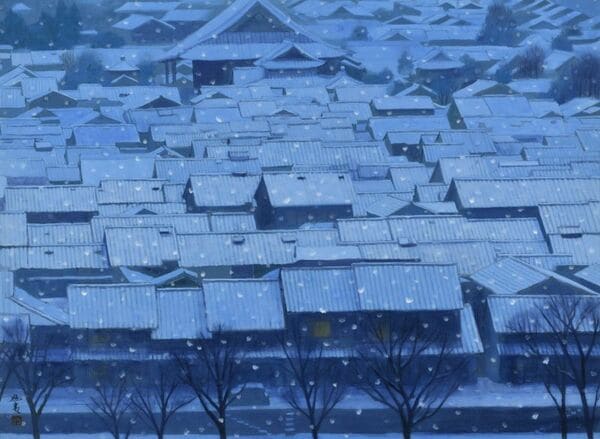 東山魁夷《年暮る》は魁夷が定宿として利用していた京都ホテル(現在のホテルオークラ京都)から見える京都の町家の光景を表した作品。親しかった川端康成から「京都のあるうちに描いておいてください」とうながされ、本作を描いたという。実際、魁夷が《年暮る》を制作した1968(昭和43)年は街の近代化が大きく進んでいた。それ以前の風景を知る魁夷は「京都で年の暮れを過ごして、除夜の鐘を聞きました。まだ瓦屋根が多く、そして四角いビルが少なかった時代で、この《年暮る》という作品は、京都への郷愁と愛惜の心から生まれたものです」との言葉を残している。