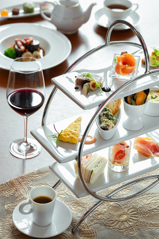 三段トレイに彩り豊かに盛り付けられたオードブルは、約10種類。冷菜には、ブリーチーズに香ばしいクルミパンを添えた一皿や、ハニーマスタードソースで仕上げた「サーモンマリネ」、オリジナルのカクテルソースを添えた「シュリンプカクテル」など、ワインや紅茶との相性も抜群のラインアップを揃えました。温菜では、じゃがいもとひき肉を重ねたグラタン「アシ・パルマンティエ」、ムール貝を白ワインで蒸した「ムール・マリニエール」などフランスの家庭料理や郷土料理をベースにしたホテルならではの味わいを楽しんでいただけます。