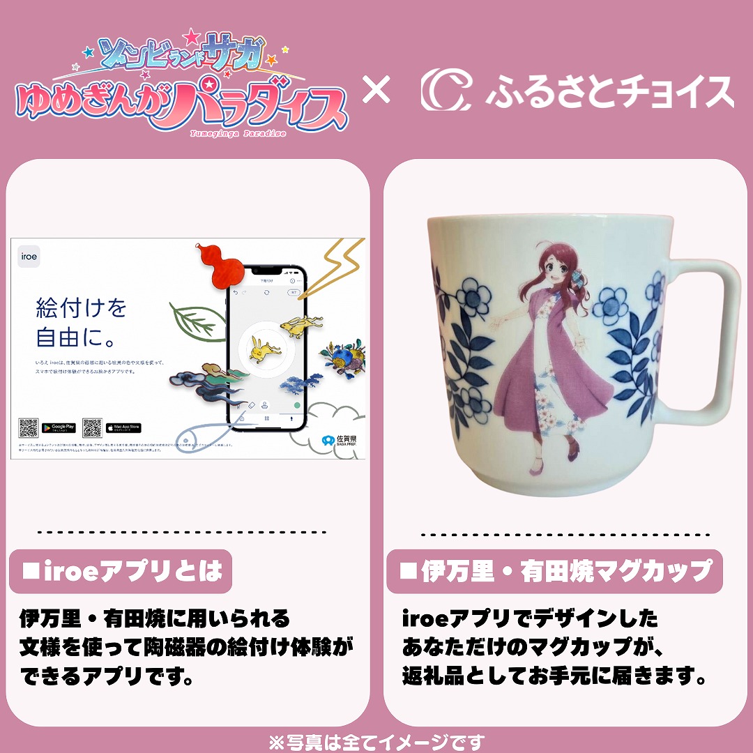iroe アプリ上で、ゾンビランドサガのオリジナル描き下ろしキャラクターと、伝統的な伊万里・有田焼の文様を自由に組み合わせてデザインできる企画。完成したデザインをもとに、キャラクター部分はプリント転写で、文様部分は伝統工芸士が手描きで再現。限定100個の返礼品となっている。