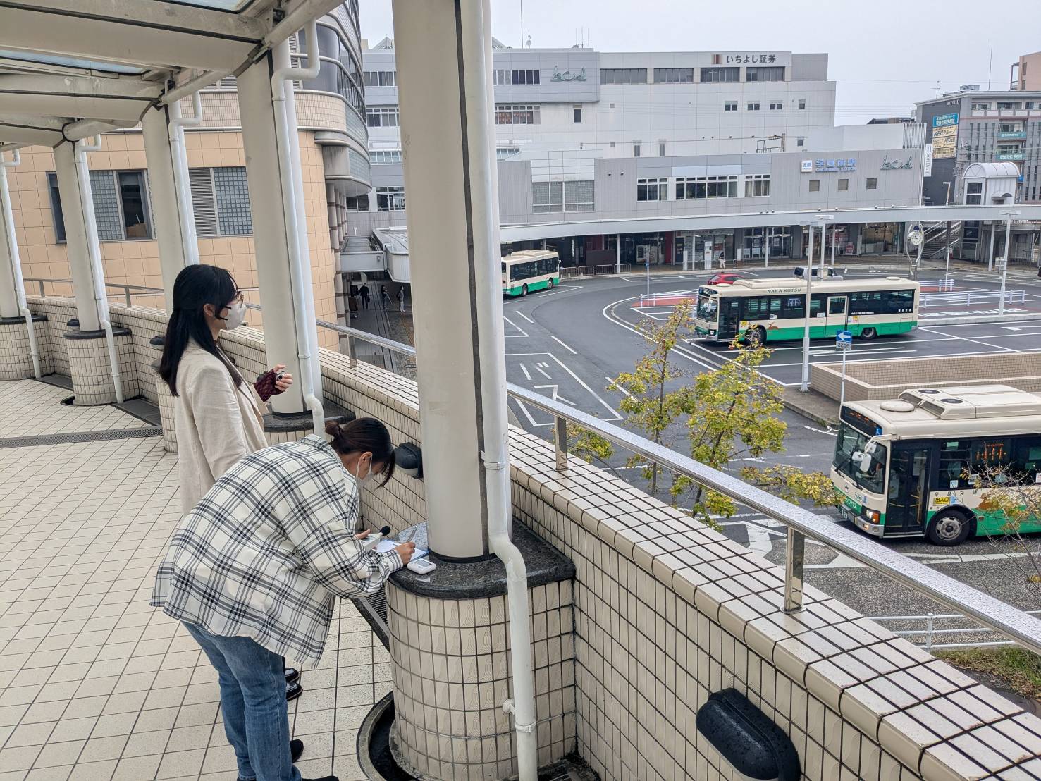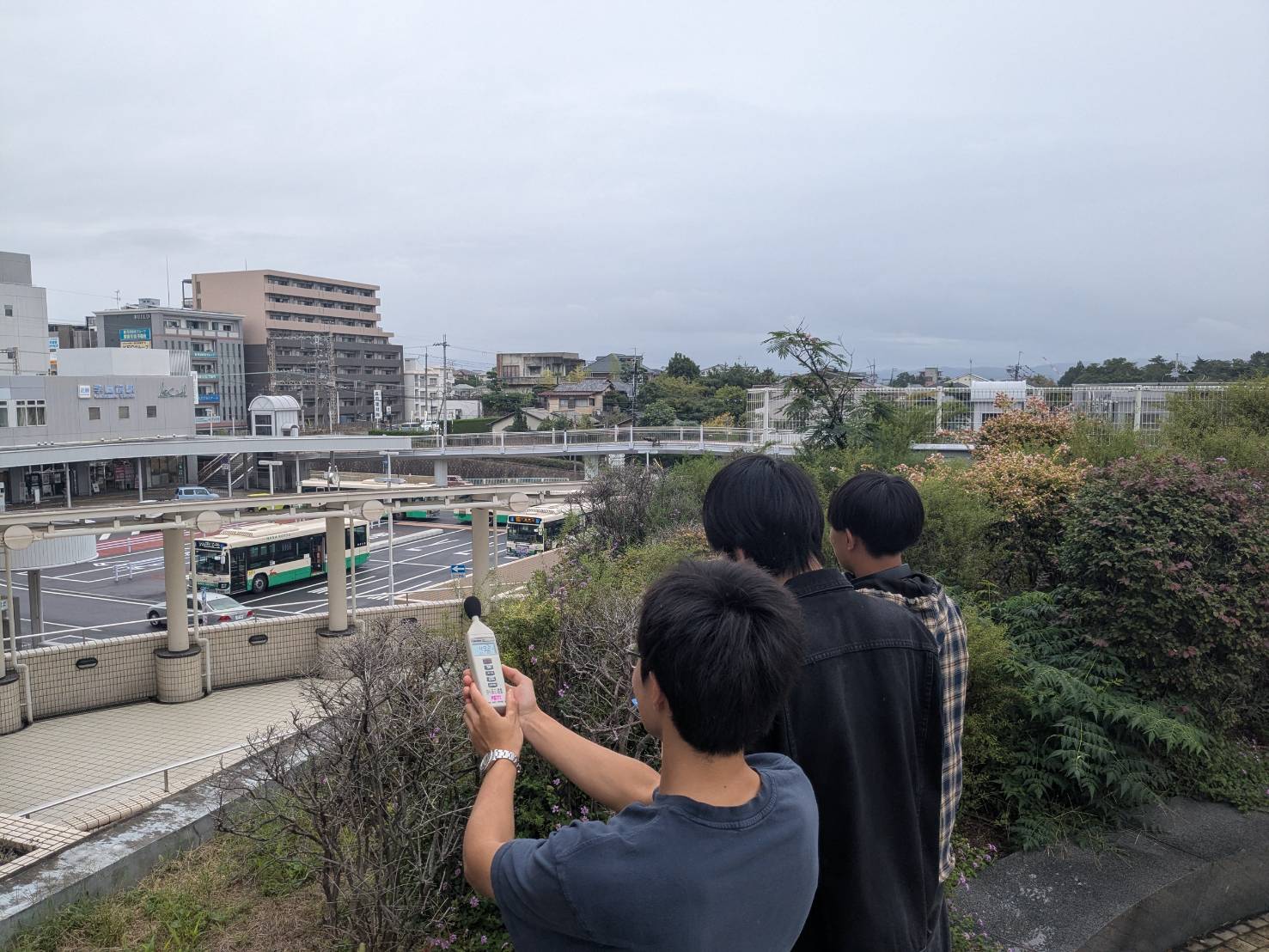 騒音測定の様子 建築実験の授業にて、大学周辺の道路騒音の測定を行いました。道路騒音は時間変動があるため、約5分間、一定間隔で測定した騒音値を平均します。測定中は、マイクが音を拾ってしまうため、おしゃべりは厳禁です。道路から離れたり、壁(ガラス)の裏に回ったりすることで騒音値が下がることなどが実感できます。 道路から離れた場所での測定 壁(ガラス)の裏での測定 © 2019 Tezukayama University Nara 奈良 奈良県 居住空間デザイン学科 帝塚山大学 現代生活学部