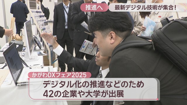 業務効率化などに役立つデジタル技術を集めた「かがわDXフェア2025」が21日、高松市のサンメッセ香川で開かれました。香川県のデジタル化の推進や地場産業同士のつながりを深めようと、42の企業や大学が出展しました。