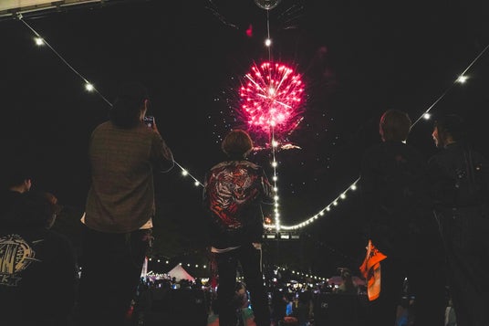 ステージから花火を眺める出演者達