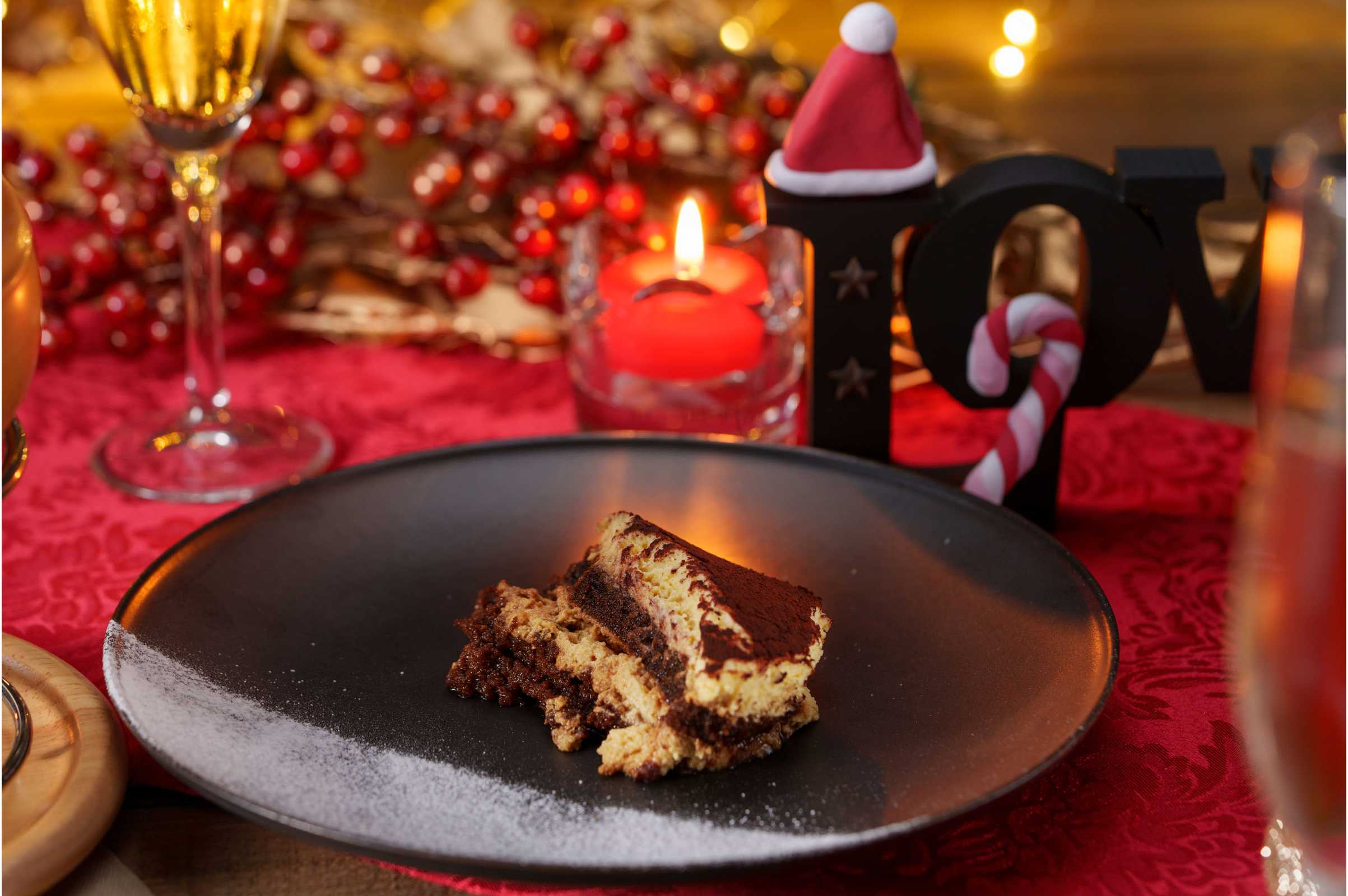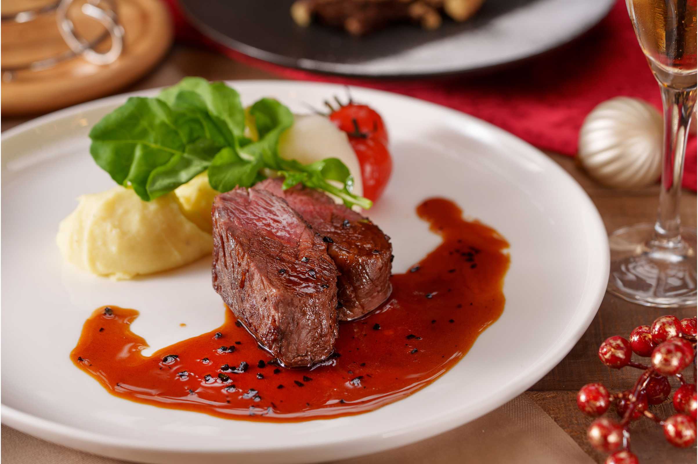 フルーツトマトやあんぽ柿、宮城県産あんこう、仙台名物の牛たん、山形県産牛など、東北ならではの食材をふんだんに取り入れた全5皿をご用意しました。前菜から魚・肉料理までをシェアスタイルで提供し、大きな器で仕立てた特製ティラミスはスタッフがテーブルで取り分けてサーブ。目の前で仕上がるライブ感とともに、聖夜のひとときをより一層特別に彩ります。