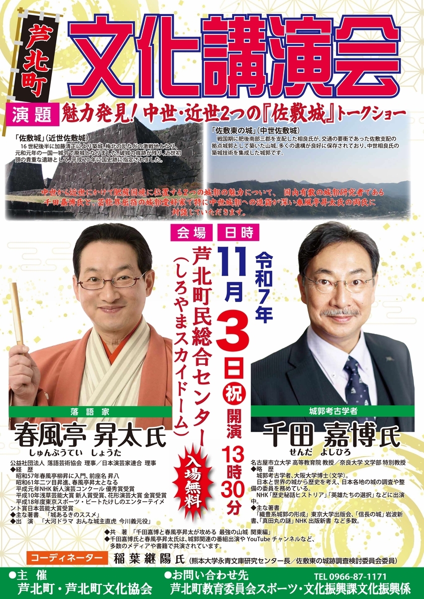 11月3日(月・祝)、芦北町民総合センター(熊本県芦北町)において芦北町文化講演会「魅力発見!中世・近世2つの『佐敷城』トークショー」が開催されます。参加無料。
