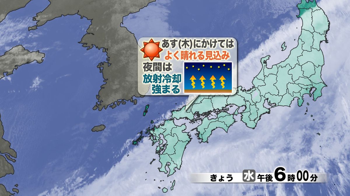 ただ、夕方になって、ようやく日本海側から雲が取れ始めました。あす23日(木)にかけては、県内各地でしっかり晴れてくる、とみています。ただし夜中からよく晴れてくると、地面の熱がどんどん上空に逃げる放射冷却の影響が強まります。