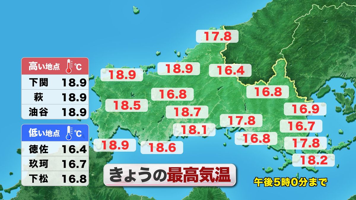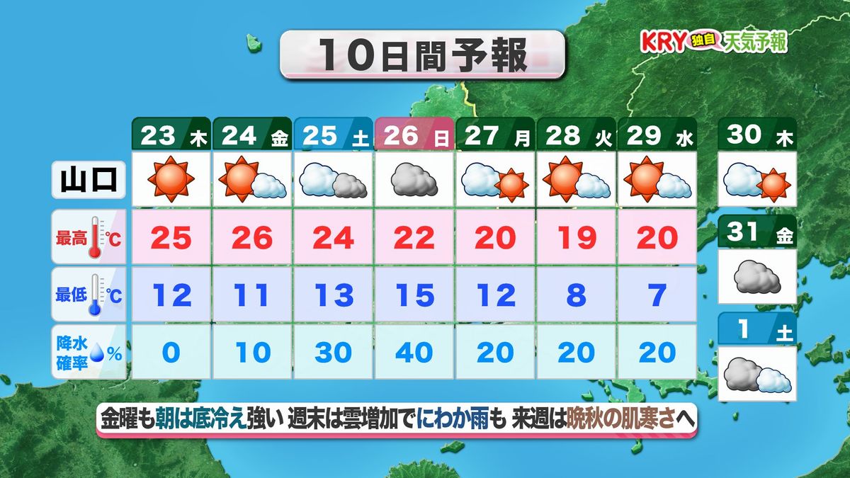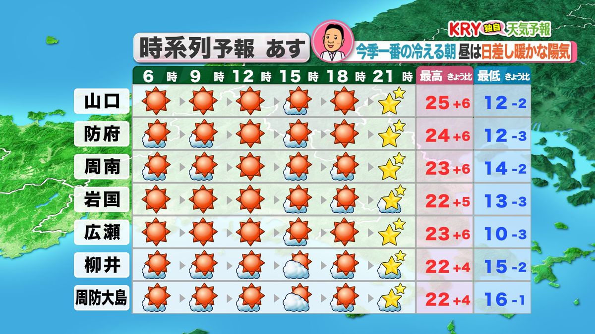 夜の間に雲は少なくなり、あす23日(木)は朝から晩まで、安定した晴天が続きそうです。朝は放射冷却の影響が強まり、各地で今シーズン一番の冷え込みに。一方で日中の気温は23度前後まで上がって、山口市内は25度に達する夏日の可能性も。昼間は日ざしが暖かな陽気になるでしょう。気温変化に合わせて服装での調節を、シッカリお願いします。