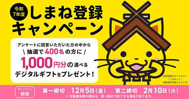いま、島根県 移住情報ポータルサイト「しまね登録」で、アンケートに答えると、抽選で400名に、1,000円分のデジタルギフト「デジコ」をプレゼント中↓↓↓