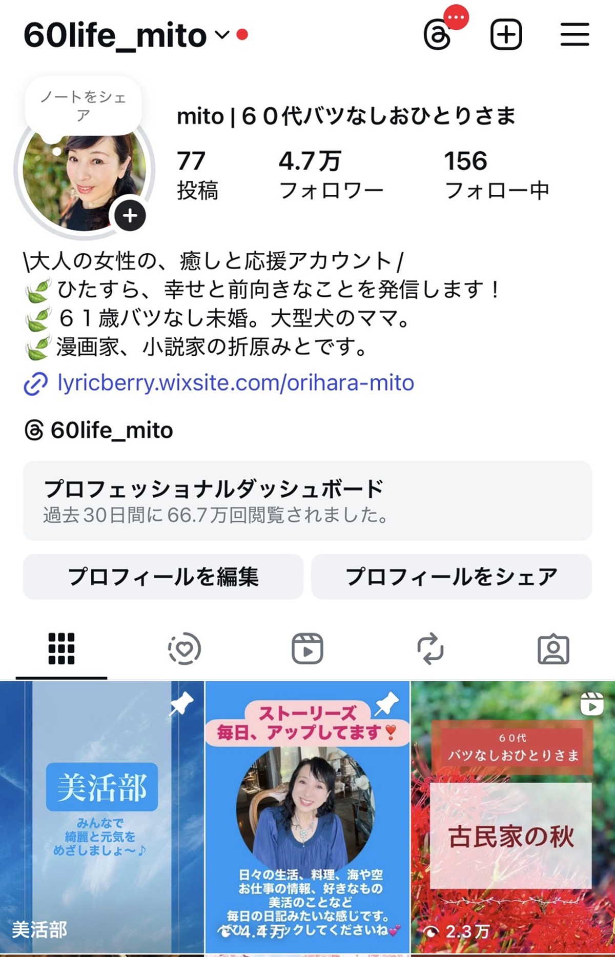 折原さんが2025年新たに開設したインスタグラム「mito/60代バツなしおひとりさま」の発信が話題!