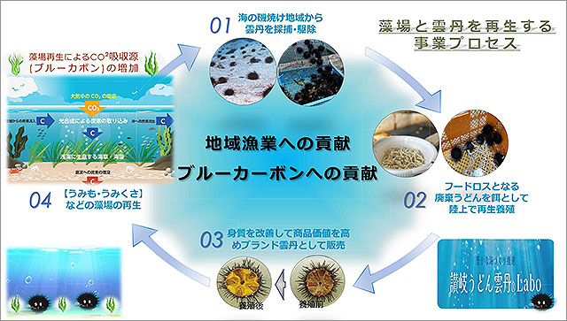 「讃岐うどん雲丹」は、ムラサキウニによる磯焼け問題への対策と、うどん廃材のリサイクル(フードロス削減)を両立した新食材。