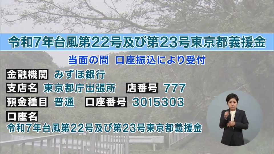 都は、先日の台風22号、23号により被害を受けた被災者への支援を実施するため、当面の間、義援金の募集などを行っています。